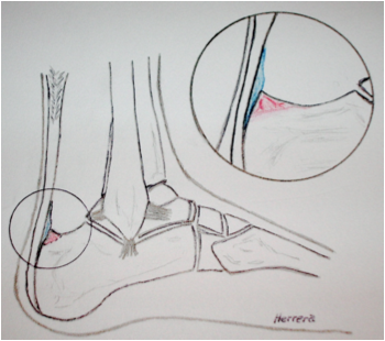 ![]() Los síntomas de la Bursitis Preaquiliana tienen un patrón clínico común: • Dolor moderado después del ejercicio que gradualmente empeora. • Una notoria sensación de rigidez muscular en la región posterior de la pierna. • Episodios de dolor difuso o localizado, en algunas ocasiones severo, en la parte mas superior del talón durante algunas horas después del ejercicio. • Dolor matinal por encima de la inserción del tendón en el talón. • Sensación de rigidez matinal en el talón, y disminución de la rigidez del tendón en la medida en que el tendón se calienta con el ejercicio o la marcha. Debido a que varias condiciones medicas diferentes presentan los mismos síntomas es necesario realizar una visita al Ortopedista cirujano de pie para que se realice un diagnostico adecuado de la enfermedad. El tratamiento depende de el grado de lesión del tendón pero usualmente incluye : • Reposo, que significa suspender la actividad deportiva o ejercicio por una semana, o cambiar a otro tipo de ejercicio en el que no se produzca una carga mecánica sobre el tendón, como la natación. • Anti-inflamatorios no esteroideos. Este tipo de medicamentos se clasifican según su sitio de acción químico en el cuerpo humano: No selectivos por la ciclooxigenasa y Selectivos por la ciclooxigenasa 2. Dentro de los Cox 2 selectivos existen dos subgrupos: los selectivos por el sitio Hidrofílico y los selectivos por el sitio hidrofóbico. En general no se ha demostrado aumento de riesgo cardiovascular para los Cox-2 selectivos hidrofílicos como el Lumiracoxib y no ha sido debidamente estudiado para los Cox no selectivos. En presencia de hipertensión arterial, hiperlipidemia (colesterol elevado) el uso de este grupo de medicamentos debe estar restringido y limitado al criterio medico por las interacciones medicamentosas en el higado que tienen estos tres grupos de medicamentos. Su abuso por parte del paciente puede conllevar una falla hepatica. • Fisioterapia: se incluye la utilización de Ultrasonido de fase continua que produce calor en el tendón reduciendo la inflamación, y una rutina de ejercicios de estiramiento y fortalecimiento progresivo y gradual de la musculatura anterior de la pierna y extensores de los dedos. • Utilización de Ortesis: Las ortesis son aparatos diseñados para darle soporte mecánico al músculo y disminuir la carga en el tendón como algunos tipos especiales de plantillas. Generalmente se indican después de seis meses de tratamiento medico con fisioterapia en el que no se ha presentado mejoría. • No se deben realizar infiltraciones con Corticoides: los corticoides quitan rápidamente el dolor pero también inhiben la capacidad de reparación de la Bursa por parte de los Sinoviocitos que son las células especializadas que reparan las pequeñas y grandes lesiones de la bursa preaquilliana. Sin infiltraciones el 85% de las Bursitis preaquilianas mejoran totalmente, mientras con la realización de infiltraciones apenas el 60% de las mismas alcanzan la mejoría. • La cirugía es siempre la ultima opción porque la tasa de mejoría no va mas allá del 60%. Consiste en liberar el tendón de la vaina que lo cubre que generalmente ha dejado de ser elástica y se ha vuelto fibrosa y la resección del fragmento óseo de la enfermedad de Haglund. La recuperación es lenta, requiere de la utilización de ortesis e incluye un programa de rehabilitación para prevenir debilidad posterior del tendón. |