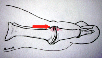 ![]() El sitio mas frecuente de artritis en el pie es la base del dedo gordo del pie (Hallux). Esta articulación se conoce como metatarso – falángica. Esta articulación es importante porque debe doblarse hacia arriba cada vez que el paciente da un paso. Cuando esta articulación se vuelve rígida, puede dificultar la marcha generando dolor.