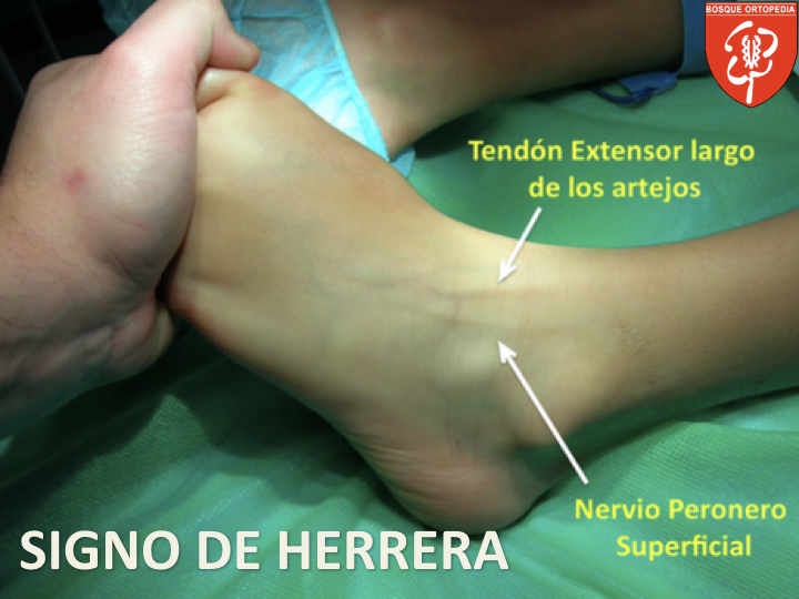 Neuritis del Peroneo Superficial![]() La neuropatía del nervio peronero superficial, es una neuropatía poco frecuente del miembro inferior. Anatómicamente, el nervio peroneo superficial es una de las ramas terminales del nervio peroneo común, la cual desciende antero lateral a los músculos peroneos y extensor digitorum longus, dando la inervación sensitiva a la cara lateral de la pierna y motora de los músculos del compartimiento antero lateral de la pierna. Se hace subcutáneo en su tercio distal al perforar la fascia superficial y sus ramas terminales son el nervio Peroneo superficial (antes llamado dorsal cutáneo) y el nervio peroneo profundo (antes llamado intermedio cutáneo del pie). La etiología es por lesión por tracción (sociado a esguince de tobillo) o compresiva, presentándose con mucha frecuencia casos traumáticos y metabólicos, y con una frecuencia mucho menor patologías tumorales. El diagnóstico es clínico y se basa en el examen clínico donde el Tinnel sobre el trayecto del nervio Peronero Superficial es positivo al igual que el signo de Herrera; las pruebas de electrofisiología son complementarias y pueden ser normales en al menos un 30% de los casos. El tratamiento es clínico y se basa en el manejo del dolor, la desensibilización, la desinflamación y la recuperación biomecánica del nervio Peroneo Superficial. El tratamiento quirúrgico se realizaba en las compresiones proximales y solo es útil para descomprimir y cuando la etiología es tumoral, con una tasa de éxito del 50%. |
